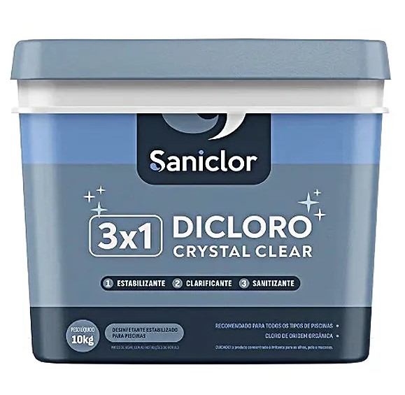 DESCRIÇÃO DICLORO 3X1 SANICLOR 1KG ESTABILIZANTE E CLARIFICANTE PARA PISCINAS MANTENHA SUA PISCINA SEMPRE LIMPA, SEGURA E CRISTALINA COM O DICLORO 3X1 SANICLOR 1KG. ESTE PRODUTO É A SOLUÇÃO COMPLETA PARA O TRATAMENTO DA ÁGUA DA SUA PISCINA, CO