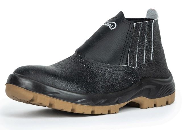 DESCRIÇÃO:CALÇADO OCUPACIONAL TIPO BOTINA, CONFECCIONADO EM COURO VAQUETA, COR PRETA, FECHAMENTO EM ELÁSTICO, PALMILHA DE MONTAGEM EM NÃO TECIDO FIXADA PELO SISTEMA STROBEL, SEM BIQUEIRA DE AÇO, SOLADO DE POLIURETANO BI DENSIDADE INJETADO DIRE