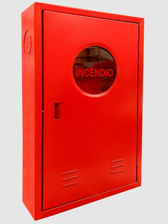 EMBUTIR CONFECCIONADO EM CHAPA DE AÇO SAE 1010; PINTURA ELETROSDTÁTICA NA COR VERMELHO TEXTURIZADO; PORTA COM ENTRADA DE AR; CONTEM MEIA LUA E ACRILICO COM DESCRIÇÃO INCÊNDIO.