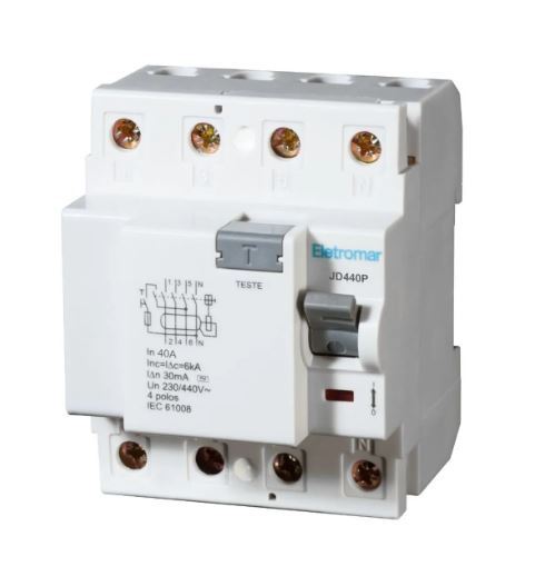 INTERRUPTORES DIFERENCIAIS ELETROMAR JD JD440PPROTEGEM PESSOAS E ANIMAIS CONTRA CONTATOS DIRETOS OU INDIRETOS EM AMBIENTES COM RISCO DE ELETROCUSSÃO. OS INTERRUPTORES DIFERENCIAIS RESIDUAIS DE SENSIBILIDADE 30MA ATENDEM ÀS EXIGÊNCIAS RESID