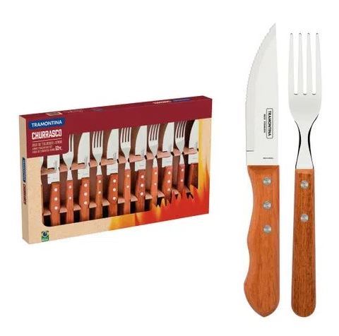 JOGO PARA CHURRASCO TRAMONTINA DYNAMIC COM LÂMINAS EM AÇO INOX E CABOS DE MADEIRA NATURAL 12 PEÇASLÂMINAS DE AÇO INOX. AS LÂMINAS DAS FACAS TÊM MAIOR DURABILIDADE DO FIO DEVIDO AO TRATAMENTO TÉRMICO. AS LÂMINAS DOS GARFOS CONTA COM MAIOR ESP